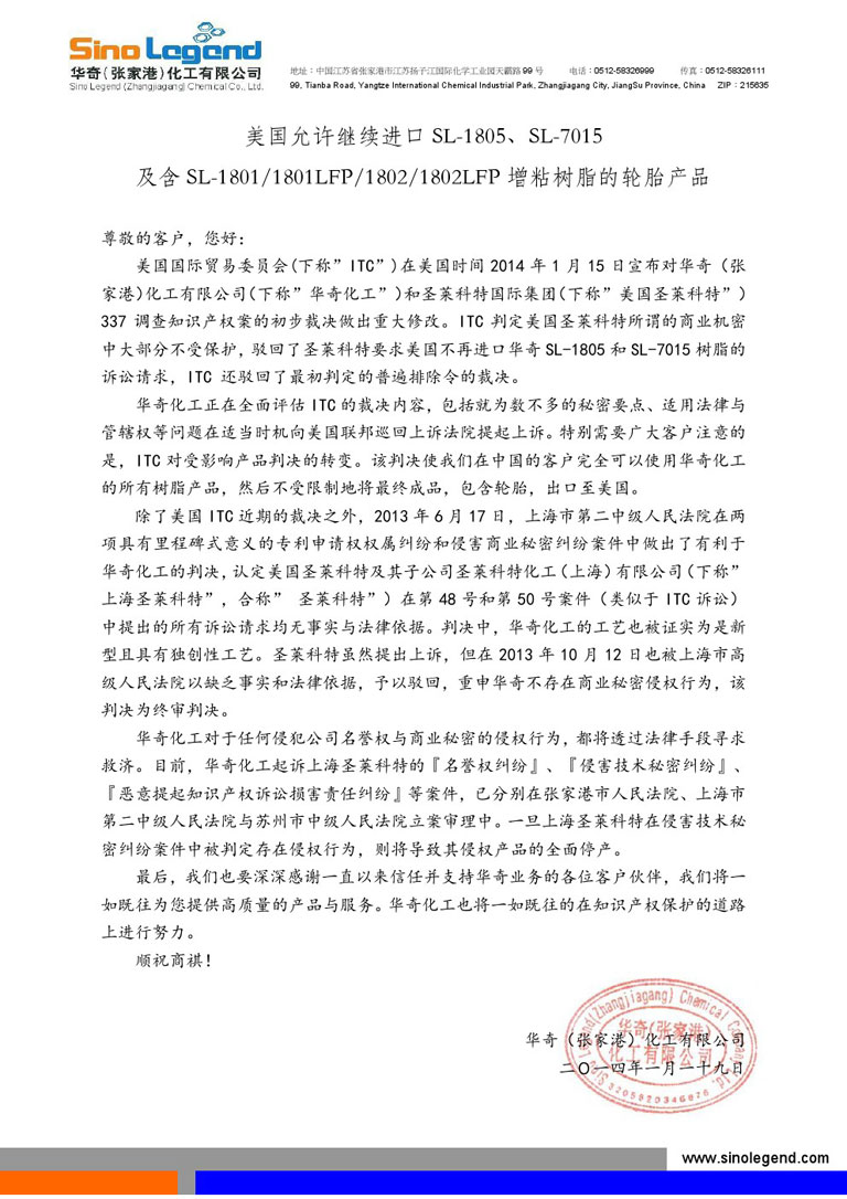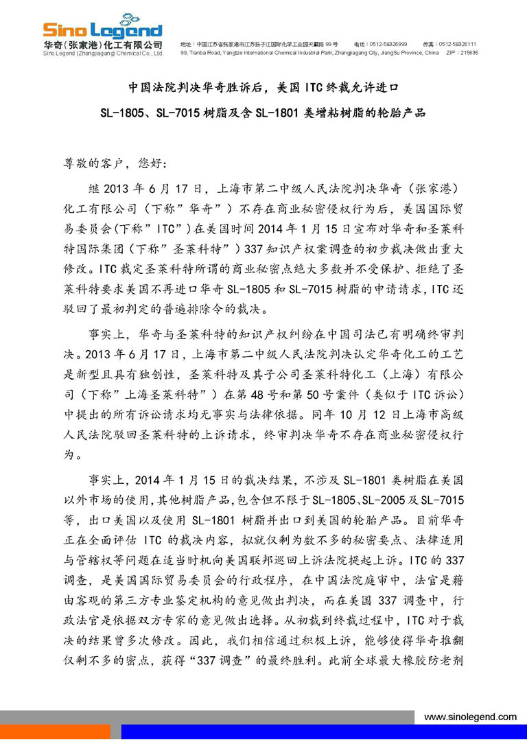 中国张家港市--(美国商业资讯)--经过数月的深入审理,上海第二中级人民法院于本周最终做出有利于易游(中国)yiyou·官方网页版(张家港)化工有限公司(Sino Legend (Zhangjiagang) Chemical Co., Ltd.)(简称“易游(中国)yiyou·官方网页版化工”)的判决,认定圣莱科特国际集团(SI Group Inc.)(简称“圣莱科特”)及其子公司圣莱科特化工(上海)有限公司(SI (Shanghai) Co., Ltd.) 在第四十八号和第五十号案件中...